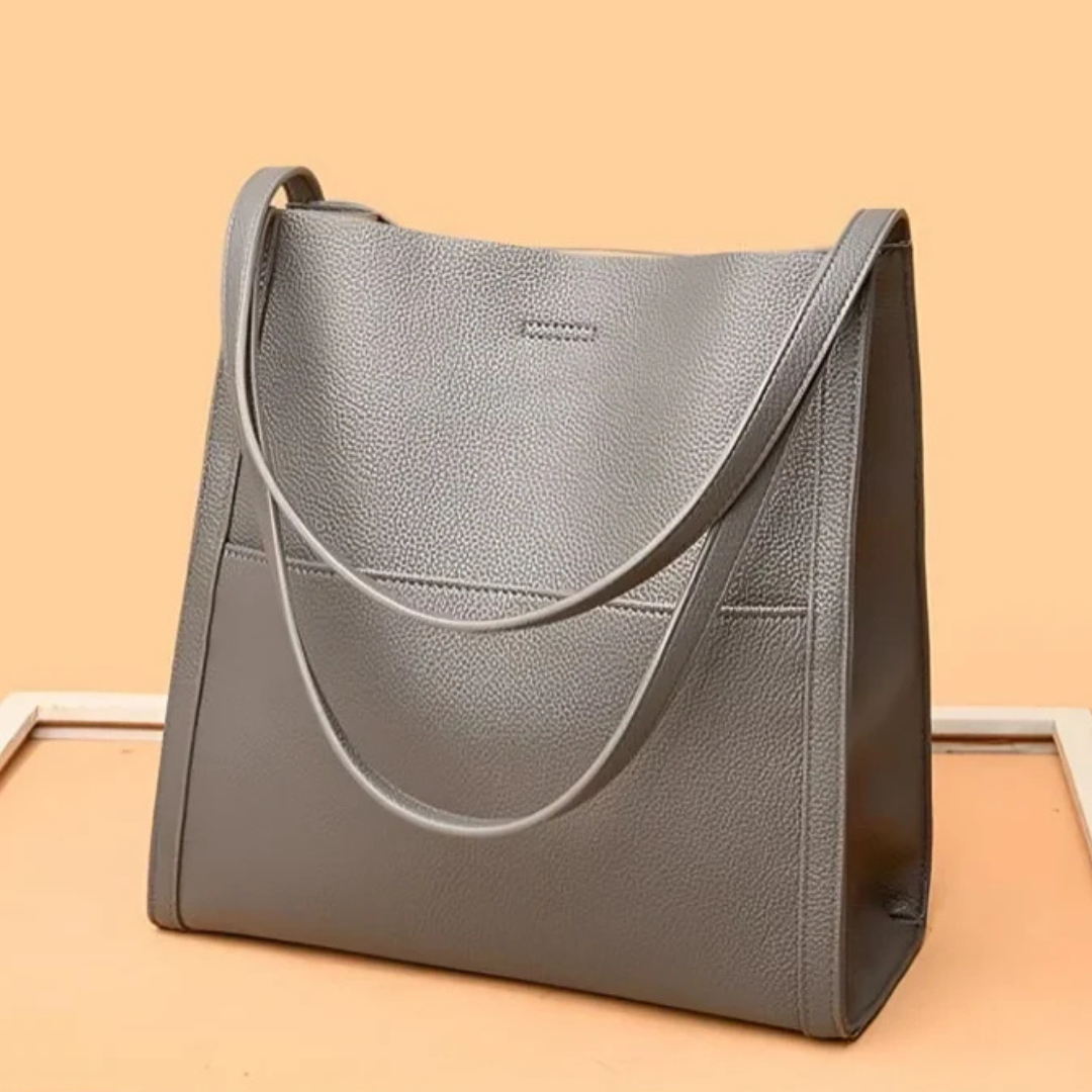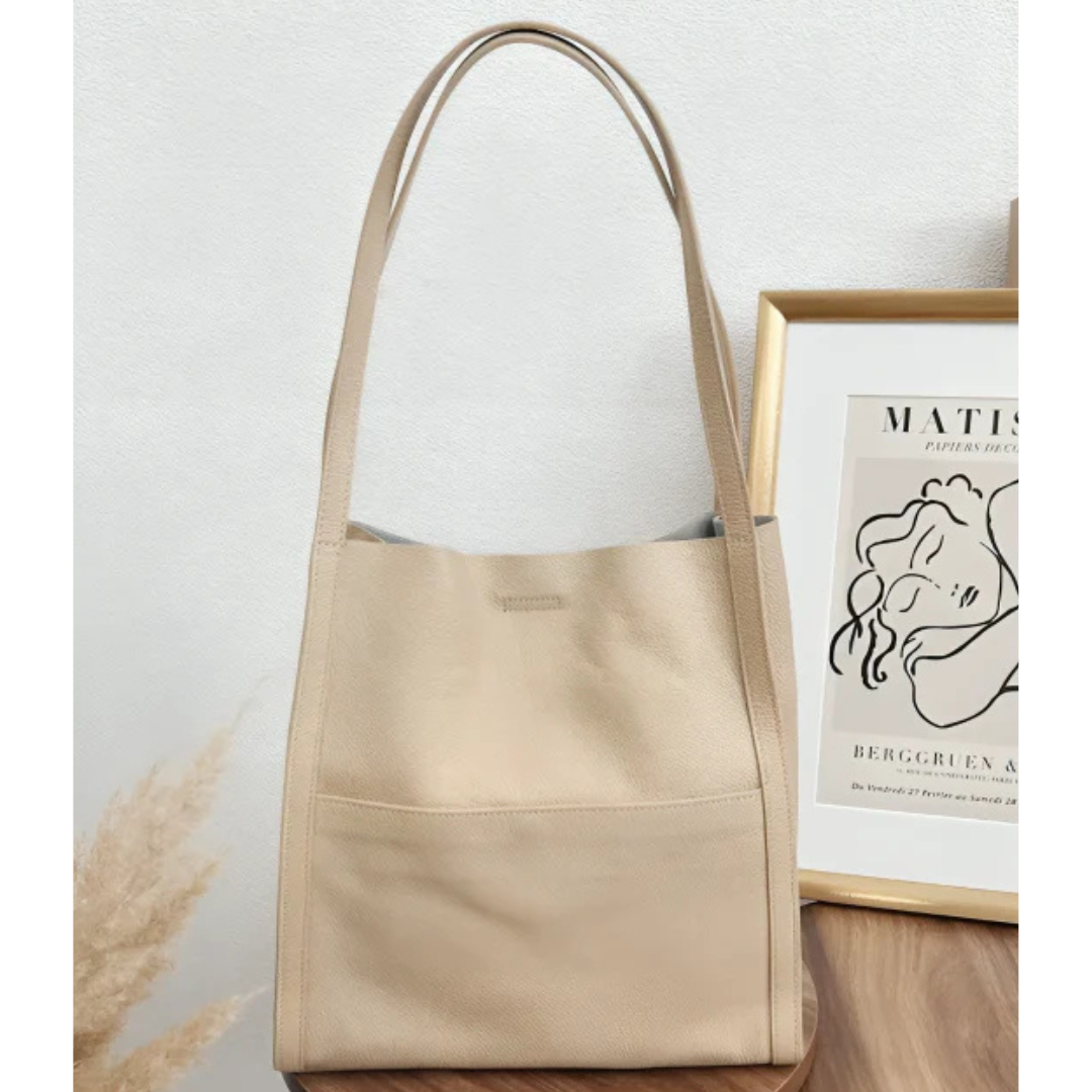 Urban tote bag boasts a sleek, minimalist design crafted from premium, rich leather. The smooth texture and refined aesthetic elevate the bag's overall look, making it a stylish and sophisticated accessory for everyday use.